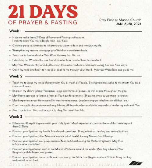 Join us January 8-28th as we intentionally seek God through prayer and fasting to kick of the New Year.